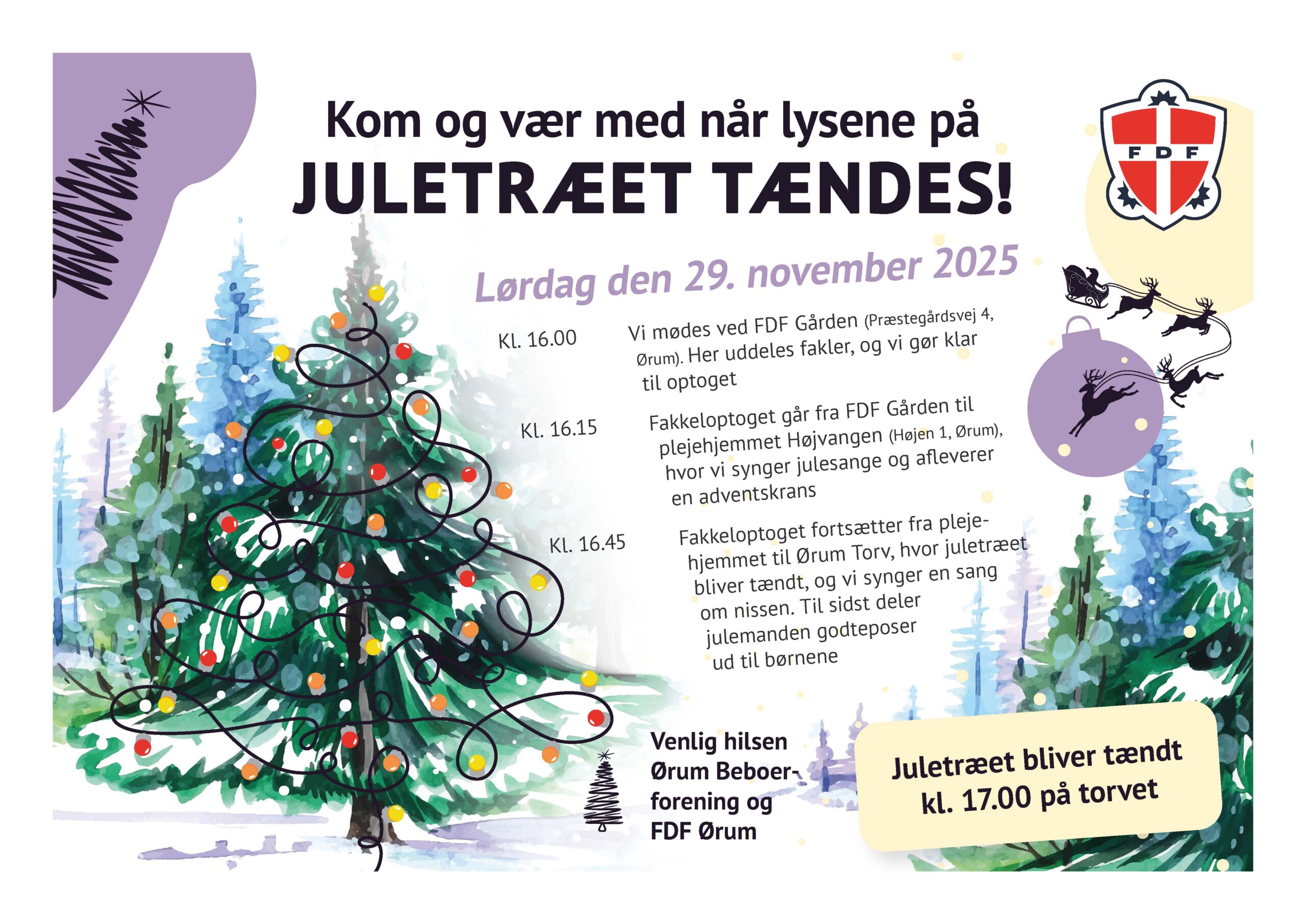 Kl. 16.15 Fakkeloptoget går fra FDF Gården og til plejehjemmet Højvangen (Højen 1, Ørum), hvor vi synger julesange og afleverer en adventskrans.